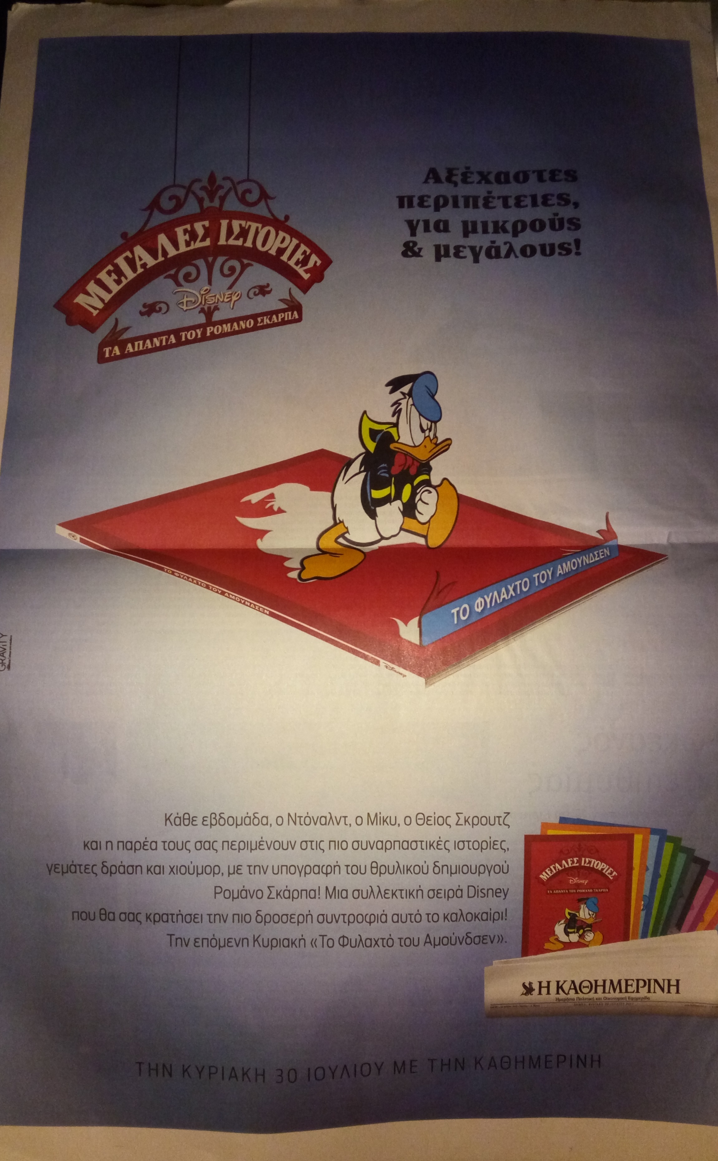Τέλος, με δεδομένο ότι οι τόμοι στη διαφήμιση έχουν τον τίτλο και τα εξώφυλλα της ιταλικής σειράς Le grandi storie Disney – L’opera omnia di Romano Scarpa, δεν νομίζω ότι πρόκειται για best of, αλλά για τους οκτώ πρώτους τόμους τής σειράς, η οποία θα κυκλοφορεί σε δόσεις κάθε καλοκαίρι, όπως έγινε και με τη μεγάλη βιβλιοθήκη. Πιστεύω ότι επιλογή να ξεκινήσει η σειρά με τον δεύτερο τόμο (προσέξτε ότι το τρίτο εξώφυλλο στη διαφήμιση είναι αυτό τού πρώτου τόμου έχει να κάνει αφ’ ενός μεν με το ότι οι περισσότερες ιστορίες τού δευτέρου τόμου έχουν ήδη κυκλοφορήσει στην Ελλάδα, οπότε χρειαζόταν λιγότερη δουλειά για να ετοιμαστεί ο τόμος, αφ’ ετέρου δε διότι ο τόμος περιέχει μια ιστορία 52 σελίδων με τους επτά νάνους, που έχουμε χρόνια, αν όχι δεκαετίες να τους δούμε στην Ελλάδα, οπότε το ελληνικό κοινό δεν είναι εξοικειωμένο μαζί τους και ίσως να αντιμετώπιζε τον τόμο αρνητικά, αν δεν ήξερε πρώτα περί τίνος πρόκειται. Ο δεύτερος αυτός λόγος ίσως να εξηγεί το γιατί ο πρώτος τόμος θα κυκλοφορήσει ως τρίτος κατά σειράν.)