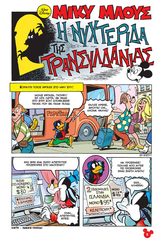 Στο επόμενο Μίκυ Μάους της Παρασκευής, έχουμε την ιστορία Η Νυχτερίδα της Τρανσυλδανίας σε σενάριο Κάστυ και  σχέδιο Enrico Faccini. Θα ξαναπω ότι το σχέδιο του Φατσίνι και συγκεκριμένα ο τρόπος που σχεδιάζει τον Μίκυ δεν μου αρέσει ιδιαίτερα… Η ιστορία είναι ότι πρέπει για Χάλογουιν 😛 Παρακάτω βλέπουμε και την περίληψη της ιστορίας από την Καθημερινή. Από ότι φαίνεται η ιστορία περιστρέφεται γύρω από την εξαφάνιση του Γκούφυ. Για να δούμε… Πάντως, στο Inducks η ιστορία έχει μια αρκετά καλή θέση. Ακόμα, έχουμε και το εναλλακτικό Ιταλικό εξώφυλλο που φώτιζε στο σκοτάδι. Πάλι το σχέδιο από τον Κάστυ.