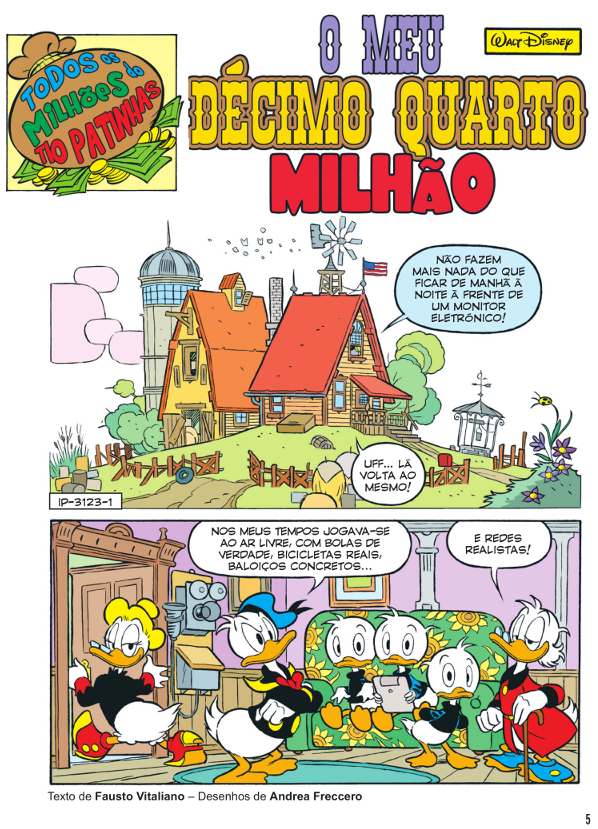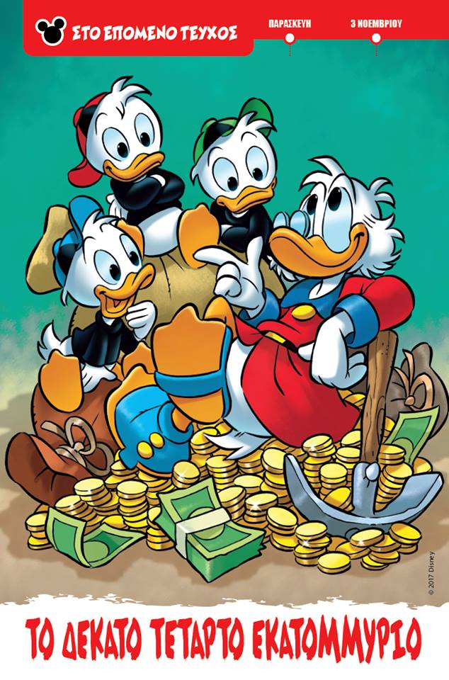 Στο επόμενο Μίκυ Μάους της Παρασκευής και το πρώτο του Νοέμβρη, έχουμε επιστροφή της σειράς Τα Εκατομμύρια του θείου Σκρουτζ. Πρόκειται για την ιστορία Το Δέκατο Τέταρτο Εκατομύριο σε σενάριο Fausto Vitaliano, σχέδιο Andrea Freccero και το εξώφυλλο από τον Alessandro Perina. Φαίνεται από τα καλά επεισόδια της σειράς, αφού στο Inducks έχει καλή βαθμολογία αλλά θα δούμε μόλις διαβάσουμε την ιστορία. Η ιστορία μπήκε στο #3123 τεύχος του Topolino, ενώ πρόσφατα μάθαμε ότι στο Topolino #3229, η σειρά ολοκληρωνέται με το εικοστό εκατομμύριο. Από ότι φαίνεται στην παραπάνω πρώτη σελίδα η ιστορία αρχίζει για άλλη μια φορά στο Αγρόκτημα της Γιαγιάς Ντακ. Το σχέδιο φαίνεται καλό. Να πω ότι θα κάνουμε κριτική της ιστορίας αλλά χρωστάμε και τις κριτικές των 3 τελευταίων τευχών του Μίκυ Μάους 😉 Αναμένουμε σύντομα και το ημερολόγιο του Νοέμβρη για αν δούμε τι μας επιφυλάσσει ο μήνας.